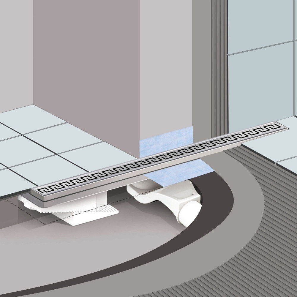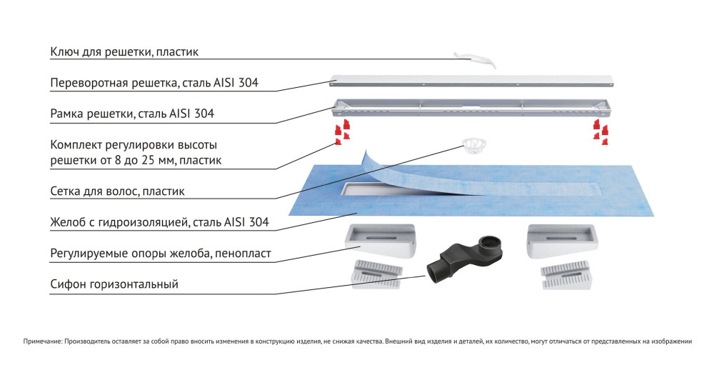 Решетка и рамка. нержавеющая сталь AISI 304Комплект регулировки высоты решетки от 8 до 25 мм. пластикСетка для волос. пластикЖелоб водосток. нержавеющая сталь AISI 304. с интегрированной гидроизоляциейРегулируемые по высоте ножки. пенопластСамопромывной S-образный сифон. полипропиленГоризонтальный выпуск D50 H60. пропускная способность 48л/мин. монтаж 360°Монтажный ключ. пластик