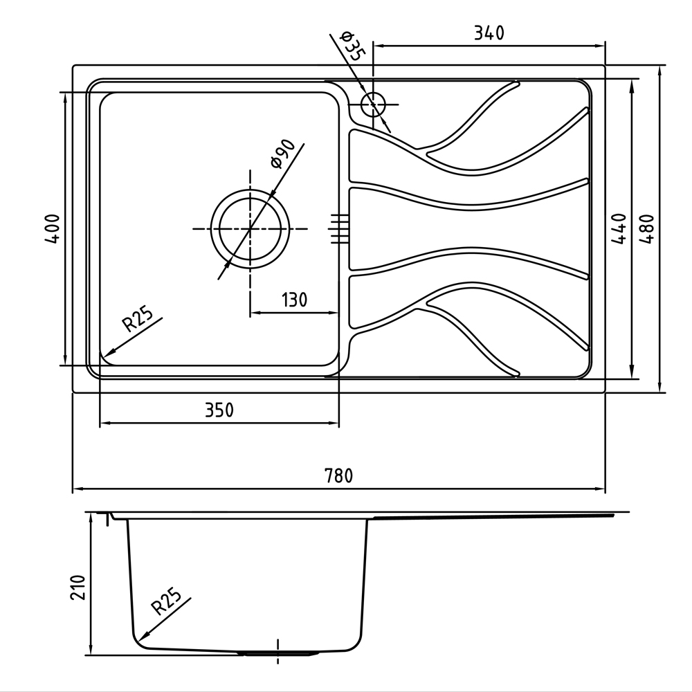 Комплектация: уплотнительная прокладка, крепления; Размер мойки: 780х480 мм; Сталь: нержавеющая, 0.9 мм; Ширина шкафа: от 45 см; Глубина чаши: 210 мм; Радиус закругления чаши: 25 мм